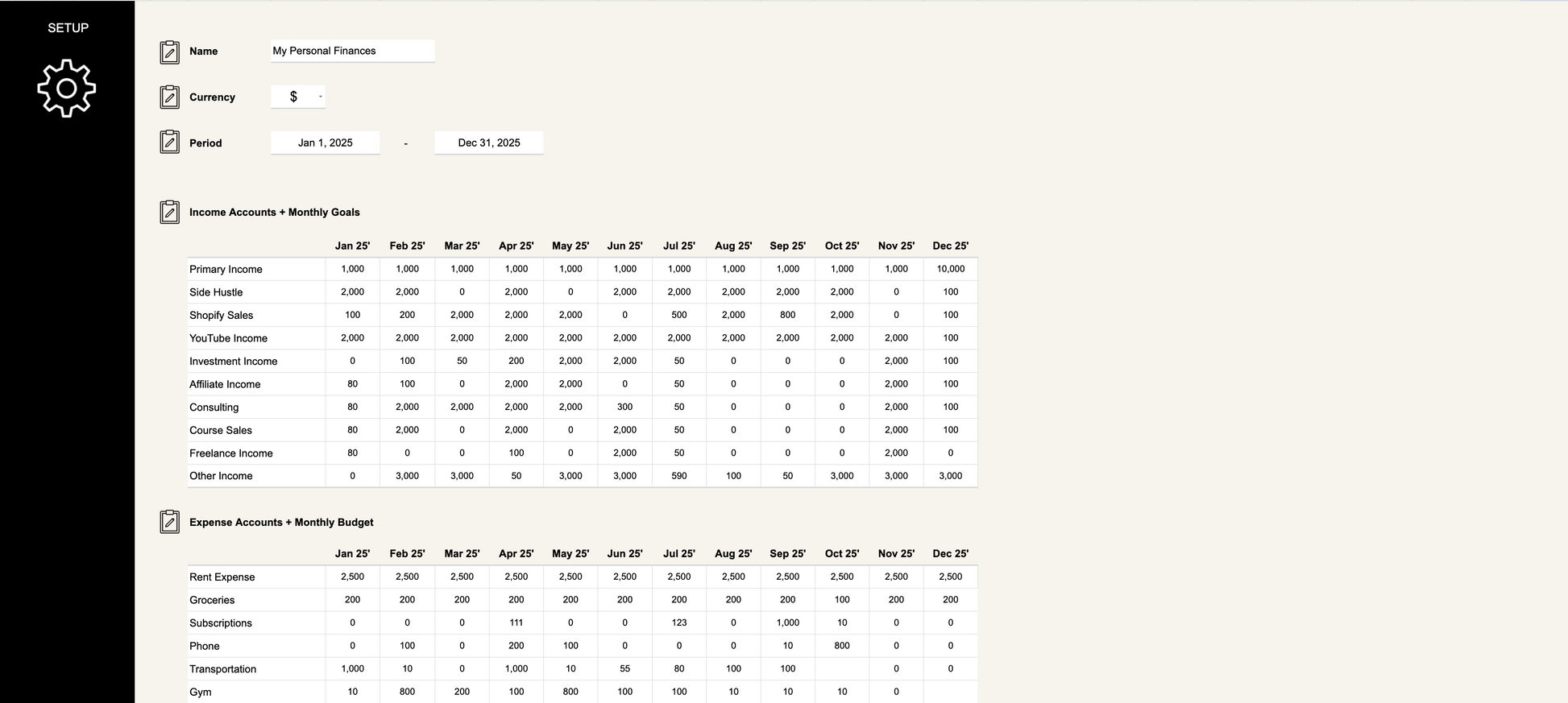 - Setup Tab: Add your name, currency, goals, and monthly budgets