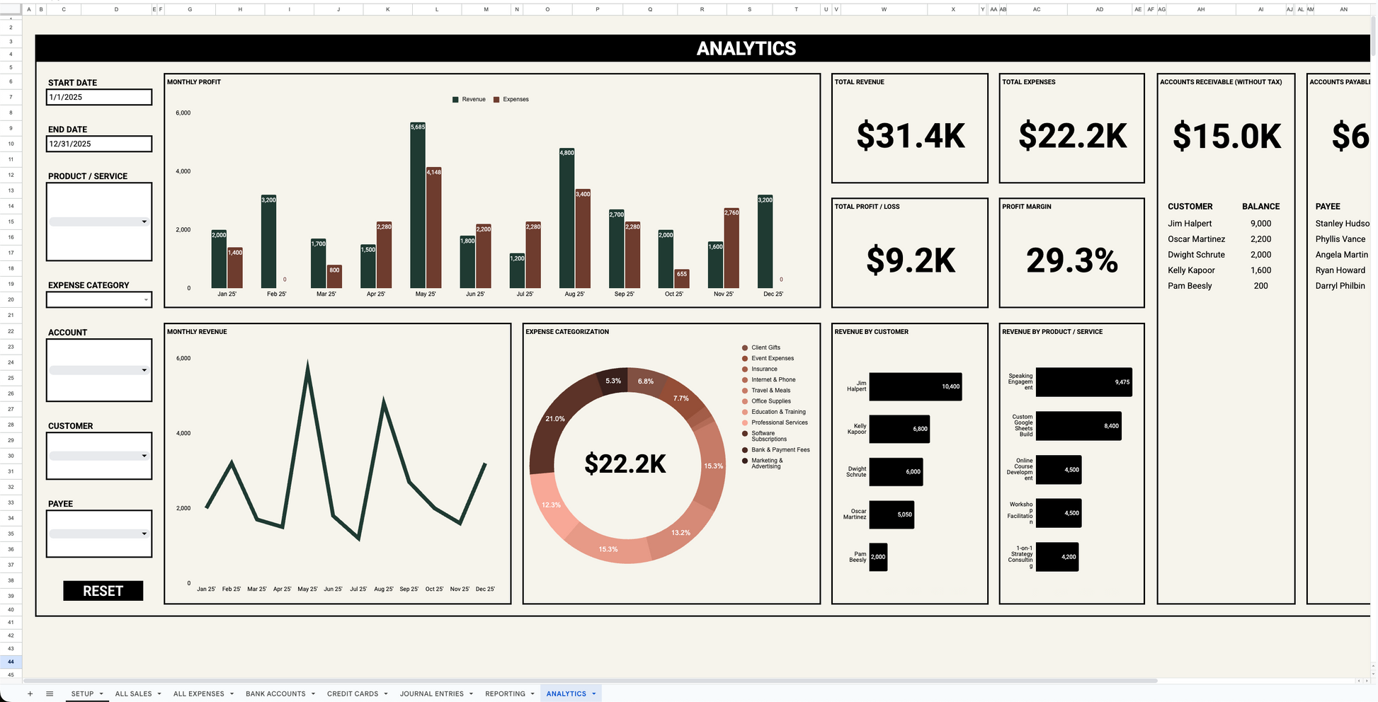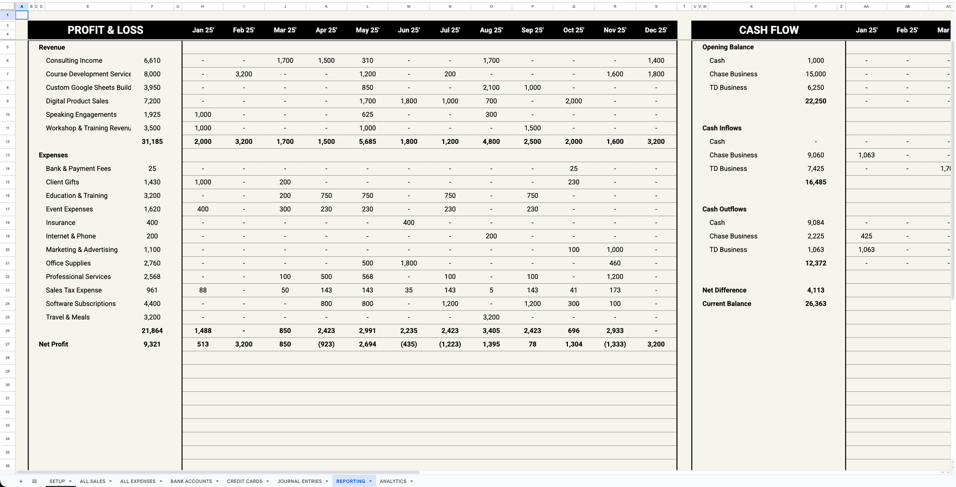 Simplify your bookkeeping with this all-in-one Google Sheets accounting template built for small business owners, freelancers, and consultants. Track income, expenses, bank accounts, credit cards, and generate auto-updating reports like P&L, cash flow, and analytics dashboards—all without needing to pay an expensive subscription fee. Just a one-time cost! Designed for ease, speed, and accuracy.